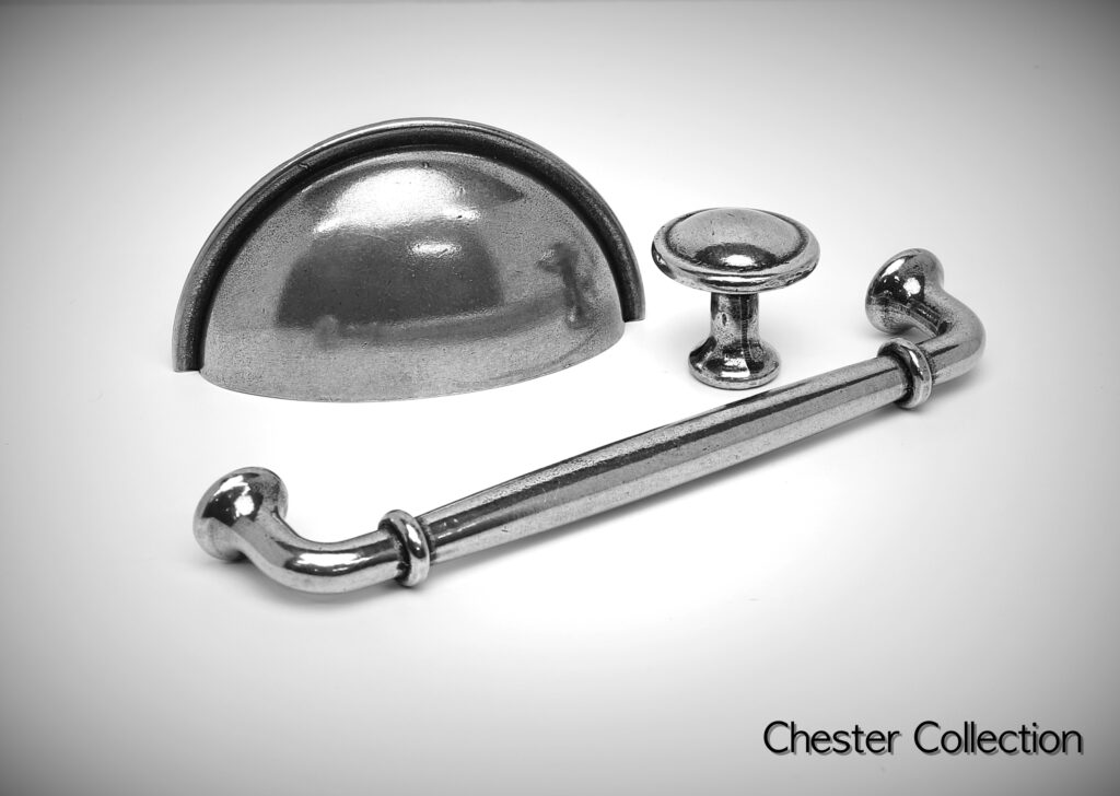 The Chester Collection from Finesse, comprises of a round cup handle, D handles and cabinet knobs, both available in two sizes.